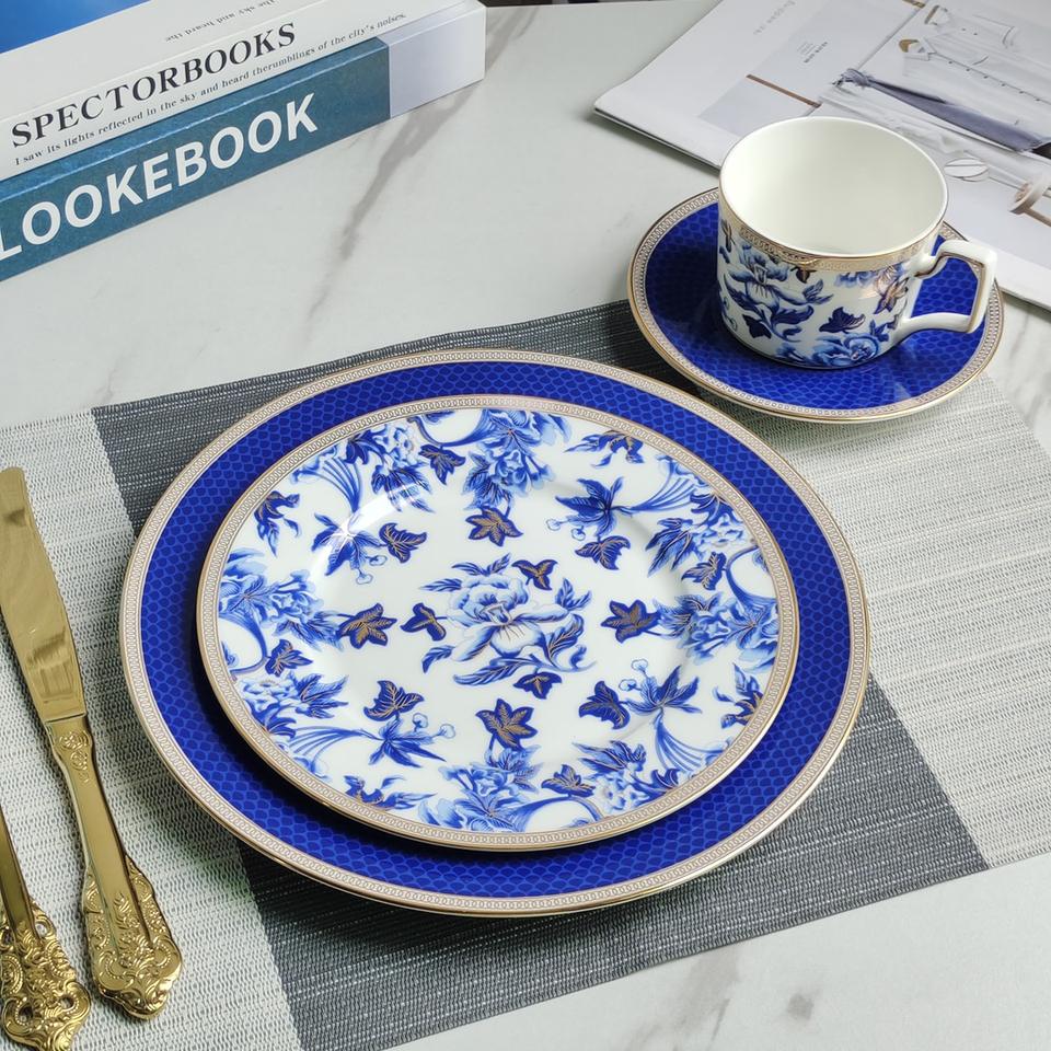 Juego de cena de porcelana china de hueso fino con borde dorado, venta al por mayor, decoración de boda de cerámica, juego de vajilla azul