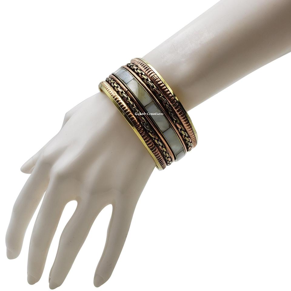 Brazalete de latón y cobre hecho a mano con incrustaciones de nácar para colecciones de joyería Bohemia, étnica y de moda