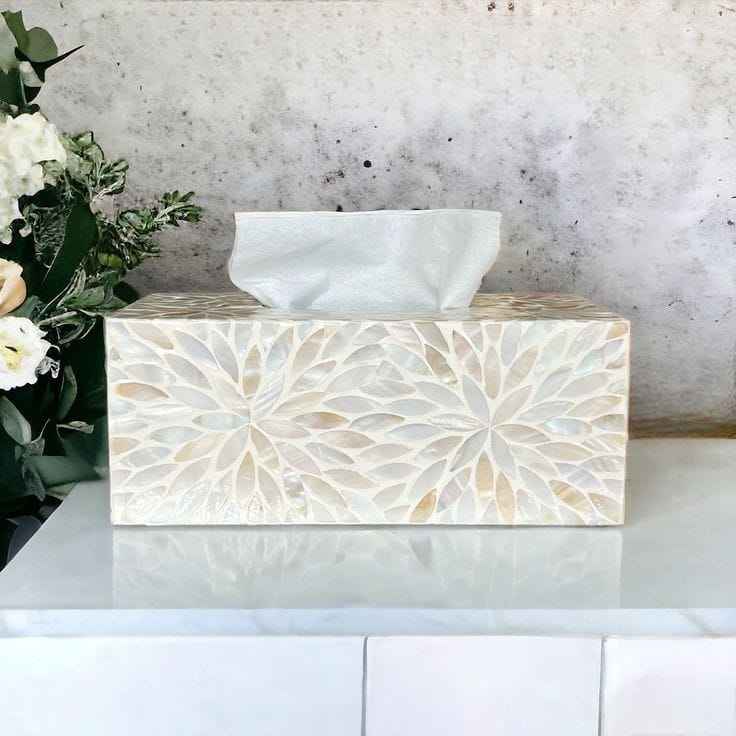Caja de pañuelos de madreperla blanca hecha a mano con diseño floral cuadrado y aspecto de mármol para uso hospitalario