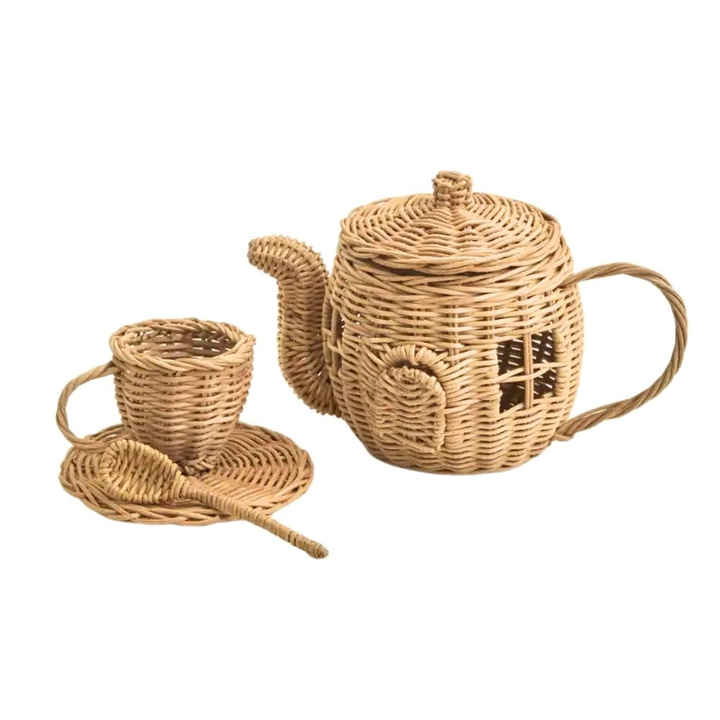Juego de tetera y taza de ratán hecho a mano, superventas, con cuchara, juguete seguro para niños