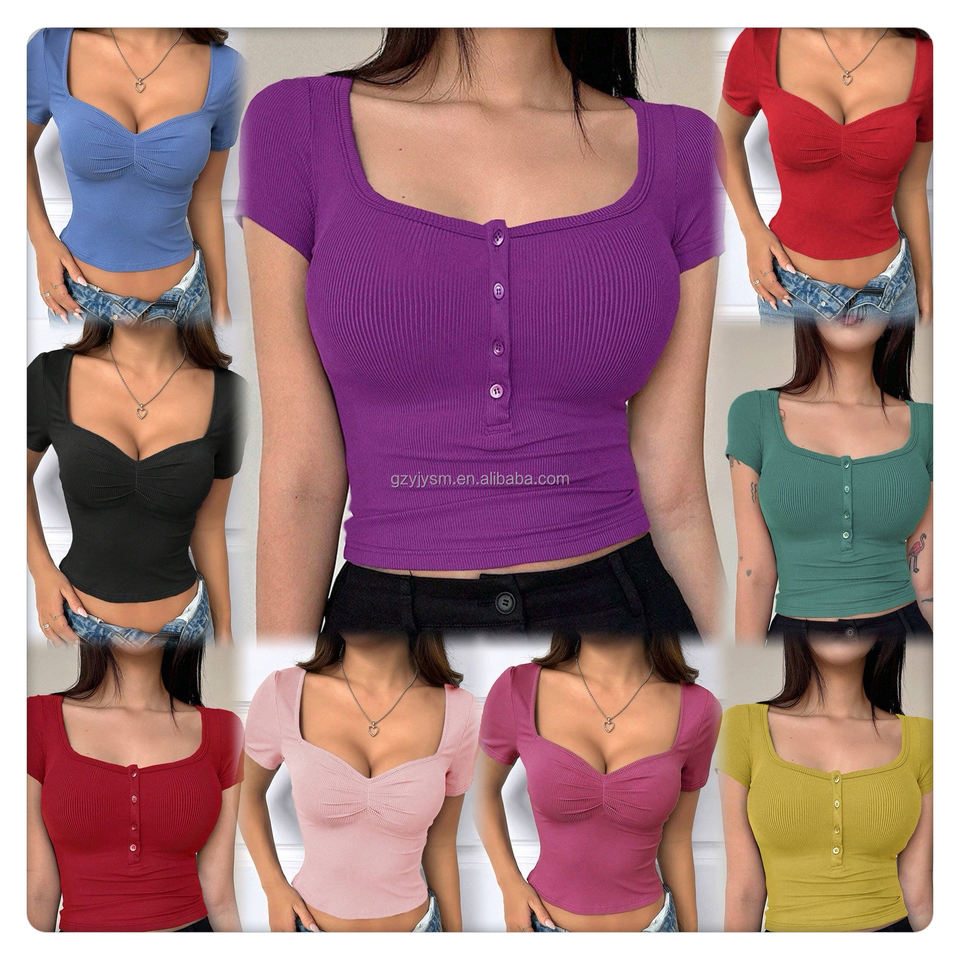 Camiseta Corta de Algodón Acordonado de Moda de Alta Calidad, Camiseta Corta Informal de Verano para Mujer, Estampada, Elástica, para Mujer