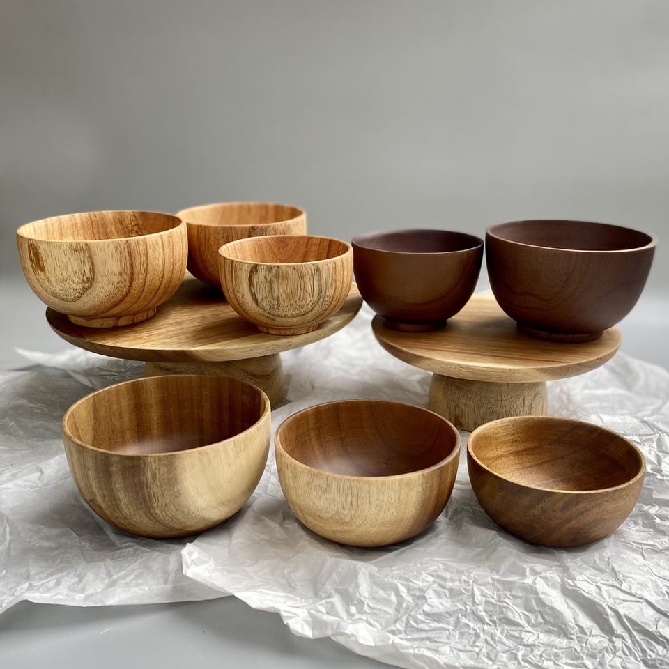 Venta caliente Decoración para el hogar Cuencos de madera con utensilios Tenedores y cucharas de madera Plato apilable de tamaño mixto para ensalada de frutas y verduras