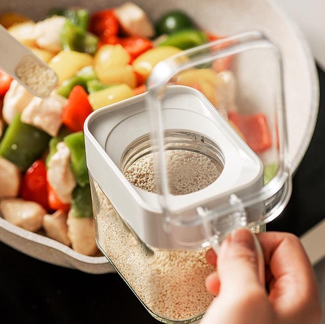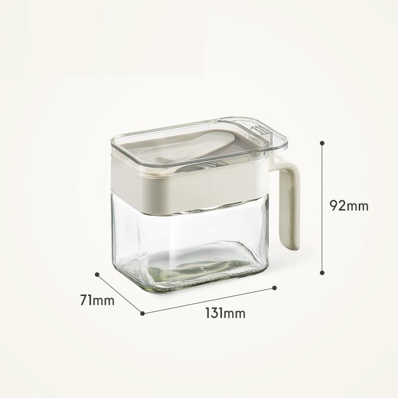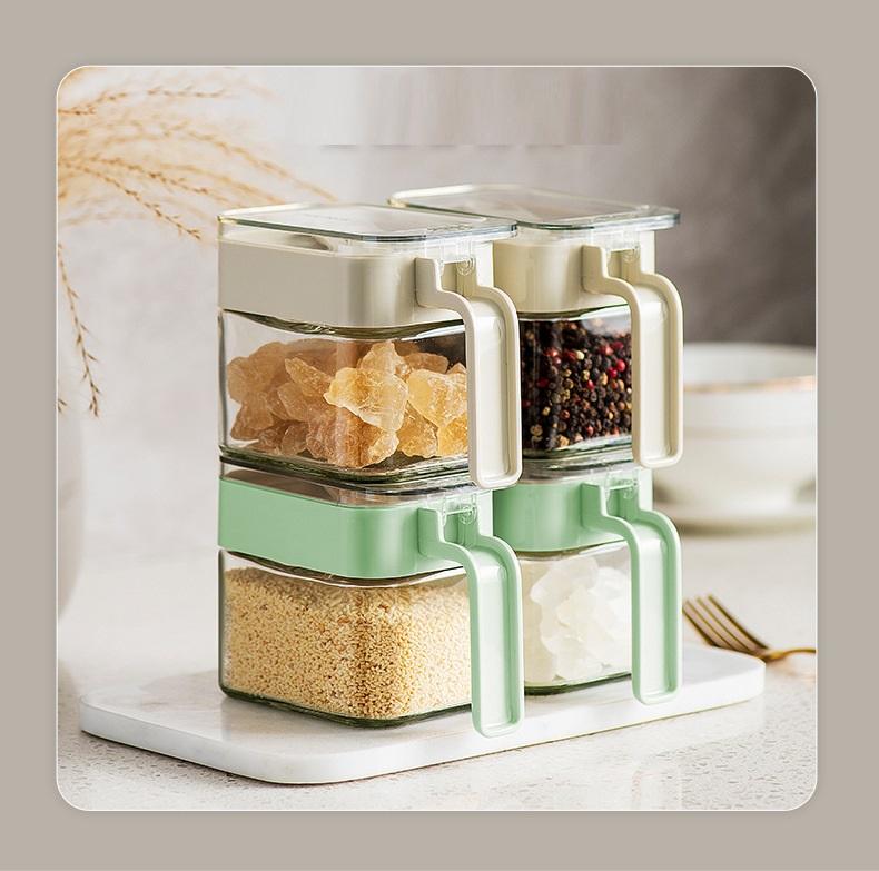 Tarro de cristal para especias de cocina de gran venta, botella de cristal para especias con cuchara y tapa, botella para especias y estante.