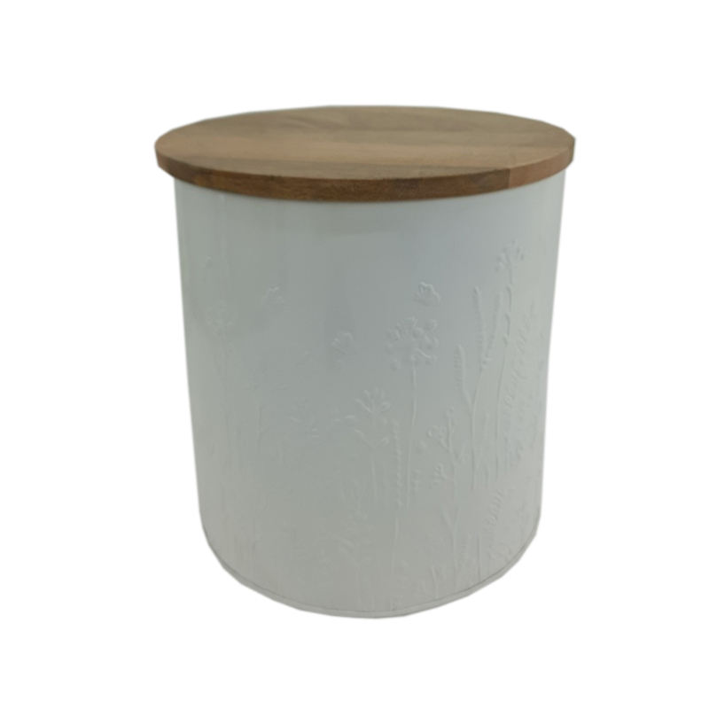 Caja redonda de hierro para almacenamiento de cocina con tapa de madera, cajas de Metal de gran tamaño de Color blanco y Natural en relieve para café