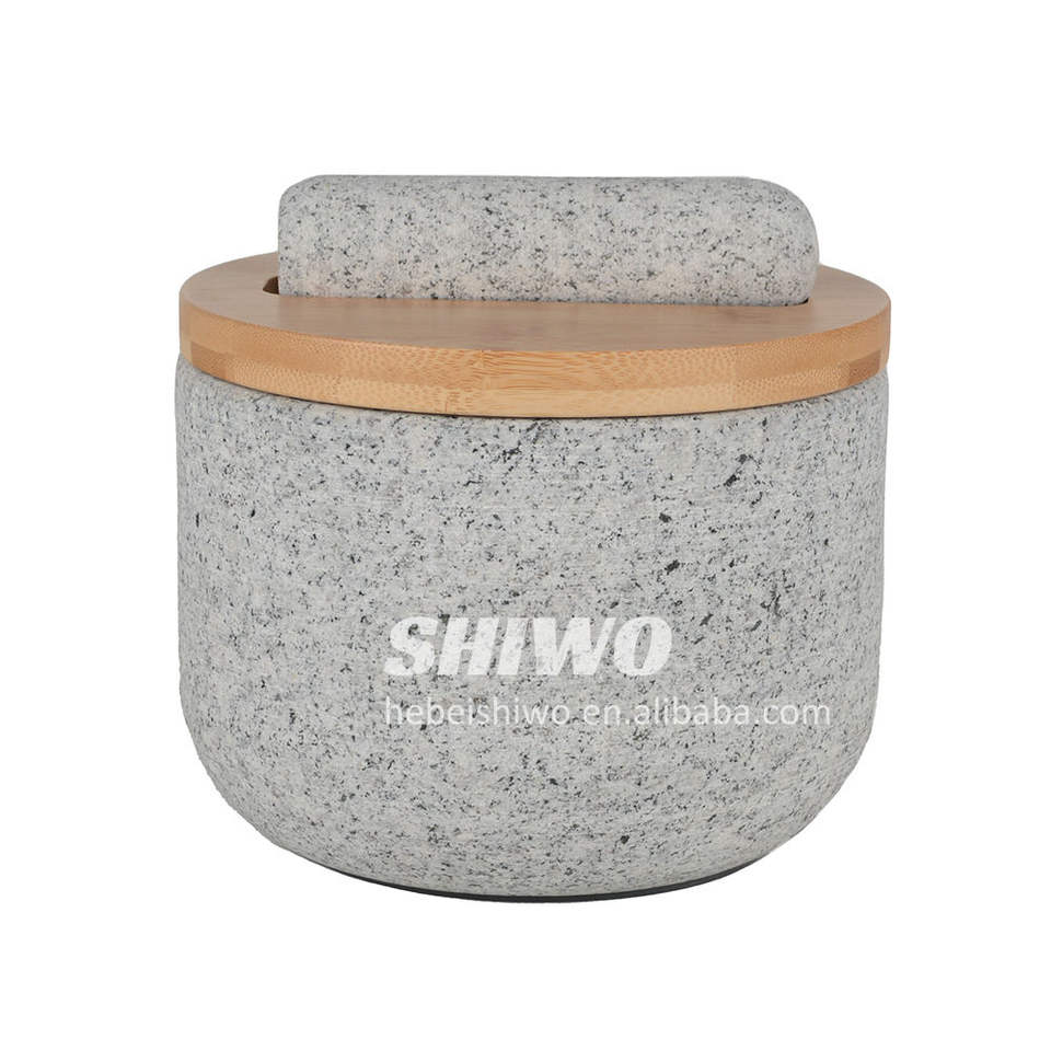 Venta caliente herramientas de cocina gran pesado Molcajete Bowl granito mortero y Maja con tapa de madera
