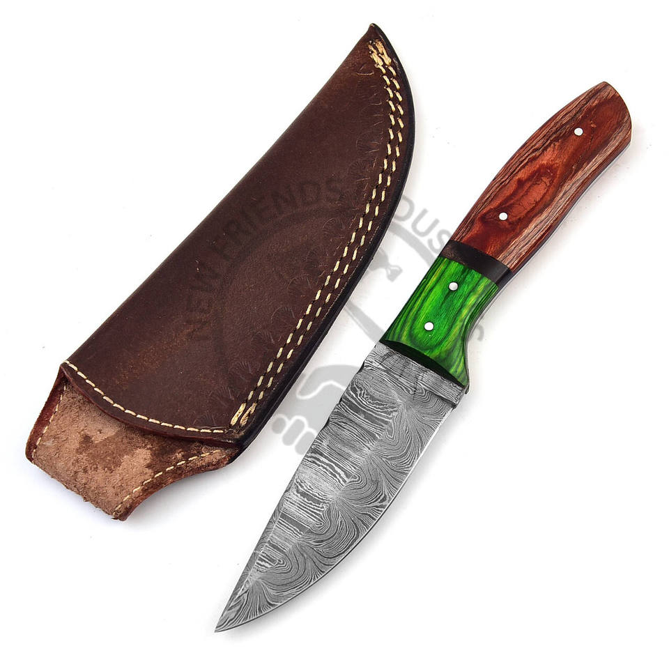 Venta caliente OEM hecho a mano cambiando las estaciones Damasco acero completo Tang caza desollar cuchillo 8 "mango de Pakkawood Funda de cuero