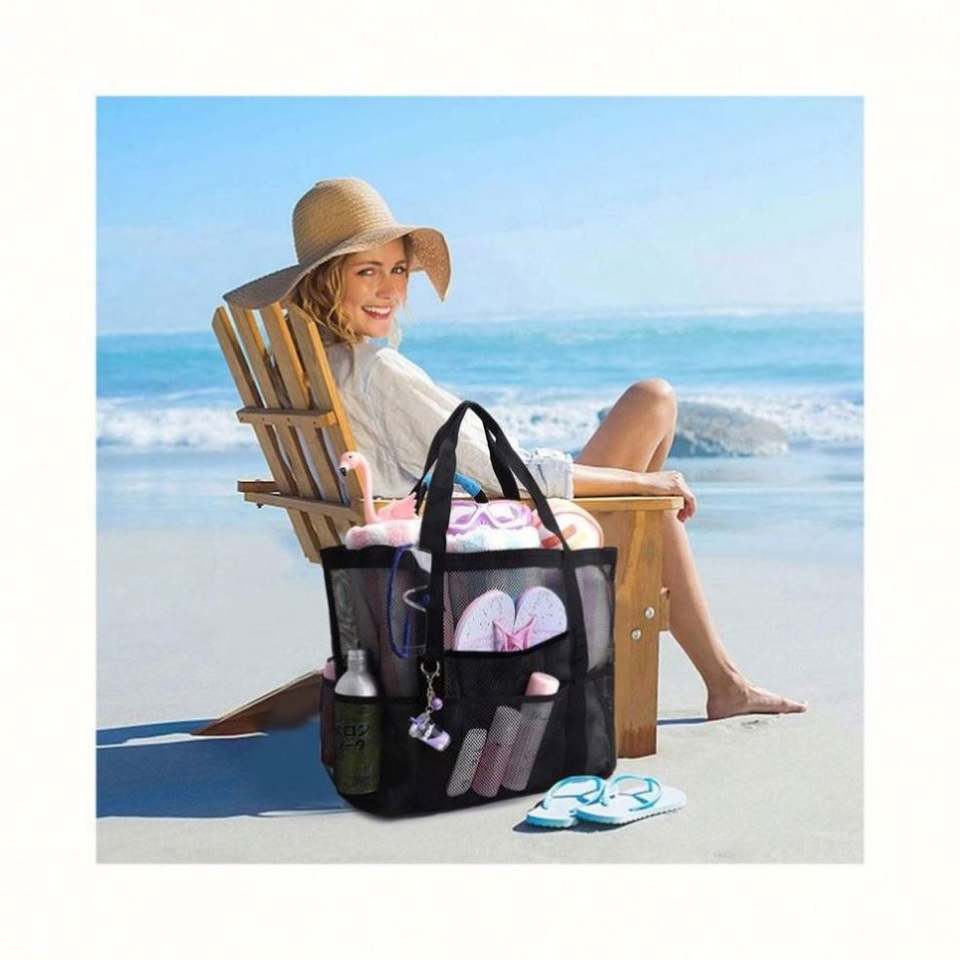 Bolsa de Playa de Malla Reutilizable, Personalizable, de Gran Capacidad, Color Sólido, Portátil, Ideal para Viajes Familiares, Venta Caliente