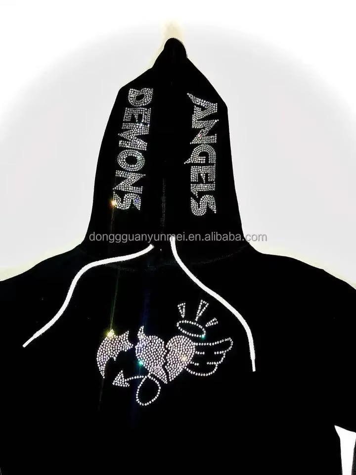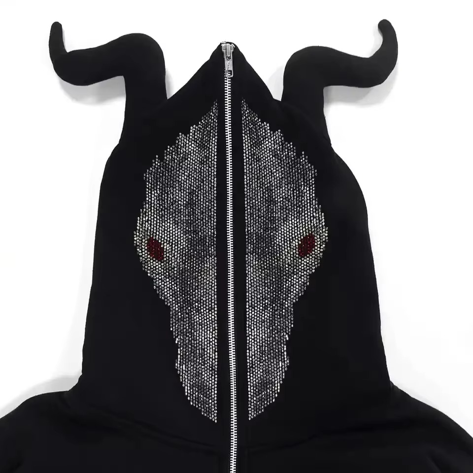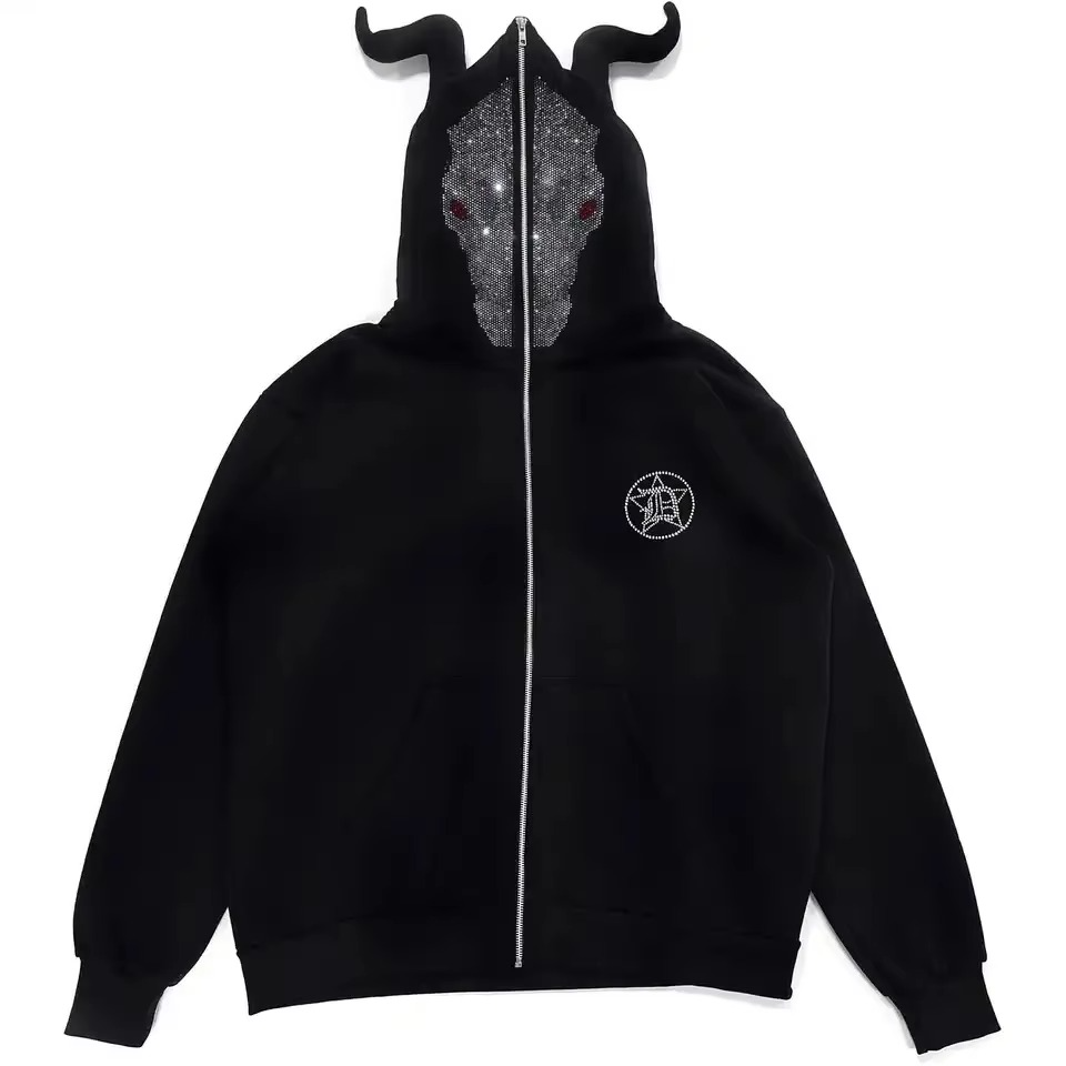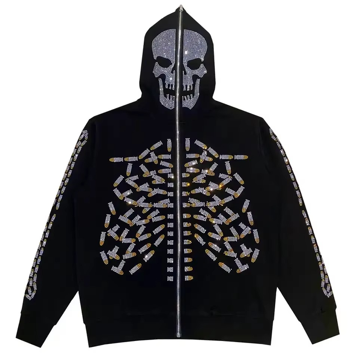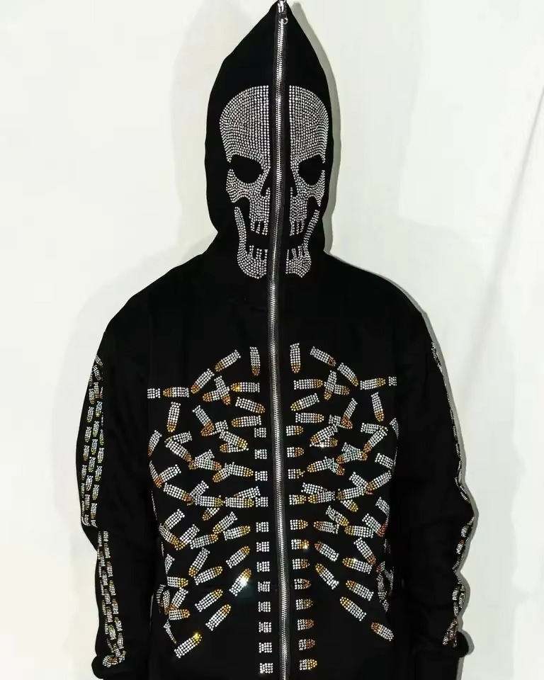 Venta caliente esqueleto estilo Rhinestone esqueleto cara completa Zip Hoodie Streetwear peso pesado Full Zip up Hoodie para hombres mujeres