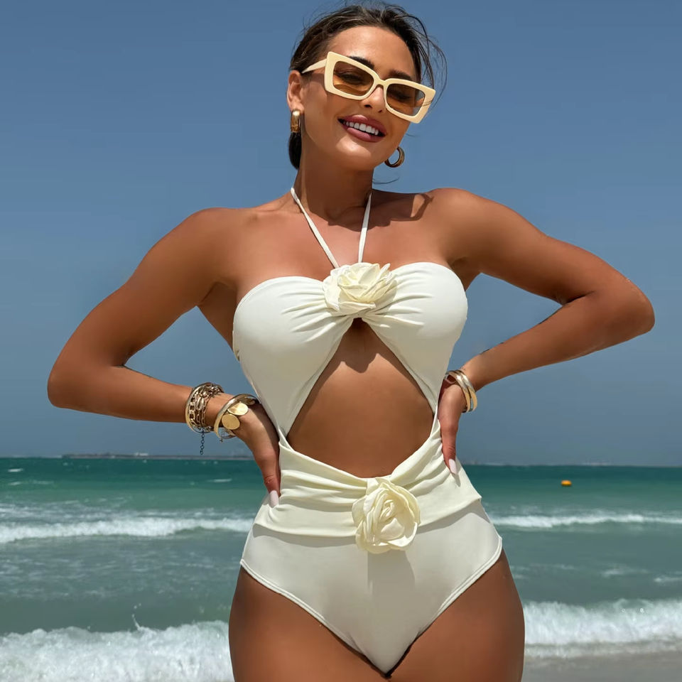 Traje de Baño de Una Pieza con Estampado Floral 3D en Color Sólido, Nuevo Modelo con Cuello Halter, Gran Venta