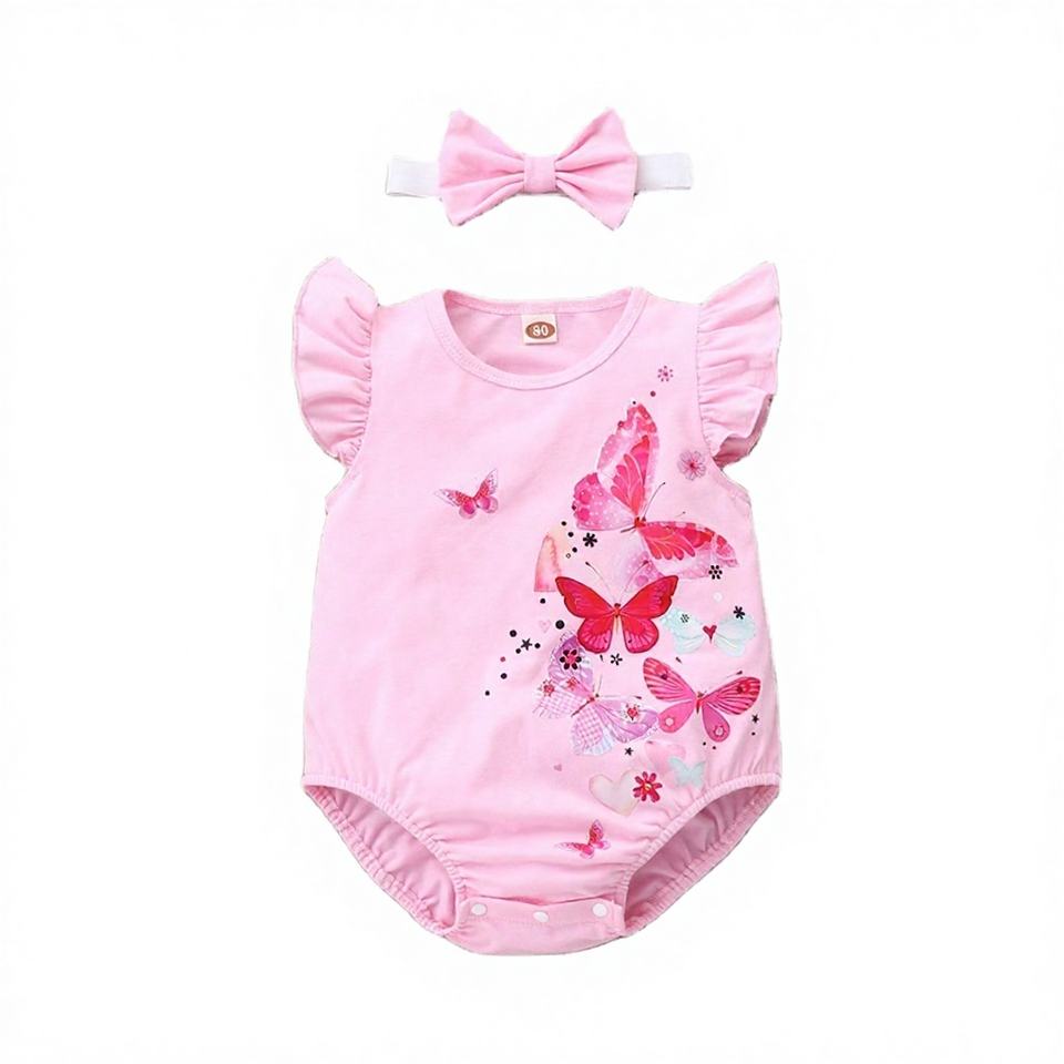 Body de Algodón para Bebé con Estampado de Mariposas y Mangas Volantes + Diadema, con Cierre de Gancho y Bucle, Tejido de Punto, 0-18 Meses, ¡Gran Venta!