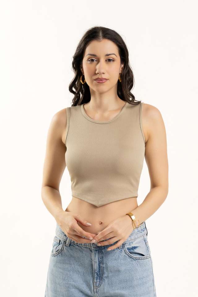 Top corto acanalado Beige estirable de gran venta, calidad superior personalizable para pedidos a granel, ropa informal de verano