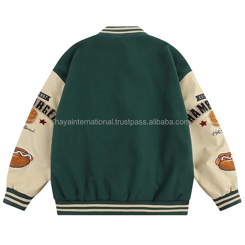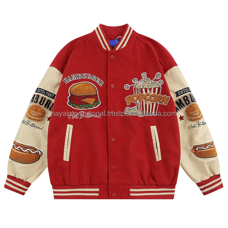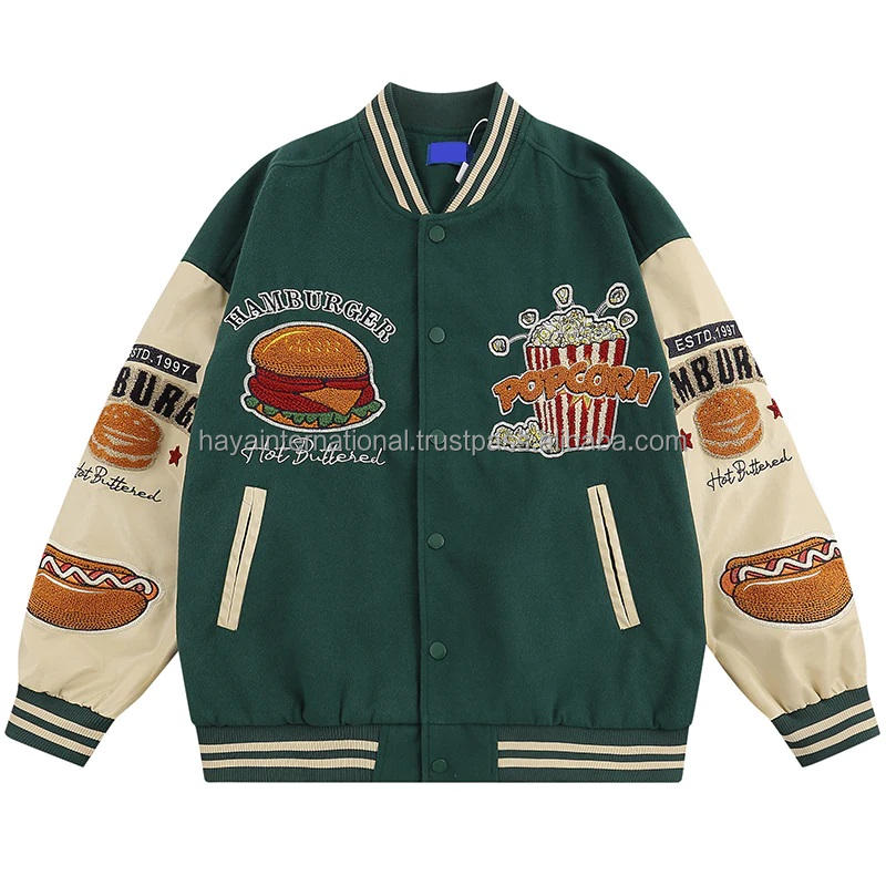 Chaqueta Varsity Informal de Lana 100% con Cuello Alto y Bordado de Diseño de Hamburguesa de Comida Rápida con Tu Propio Logotipo