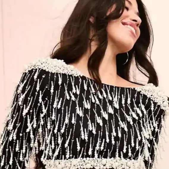 Caliente Sexy sirena silueta Mini vestido para adolescentes Faux perla lentejuelas espalda cuello alto manga larga bordado noche Natural
