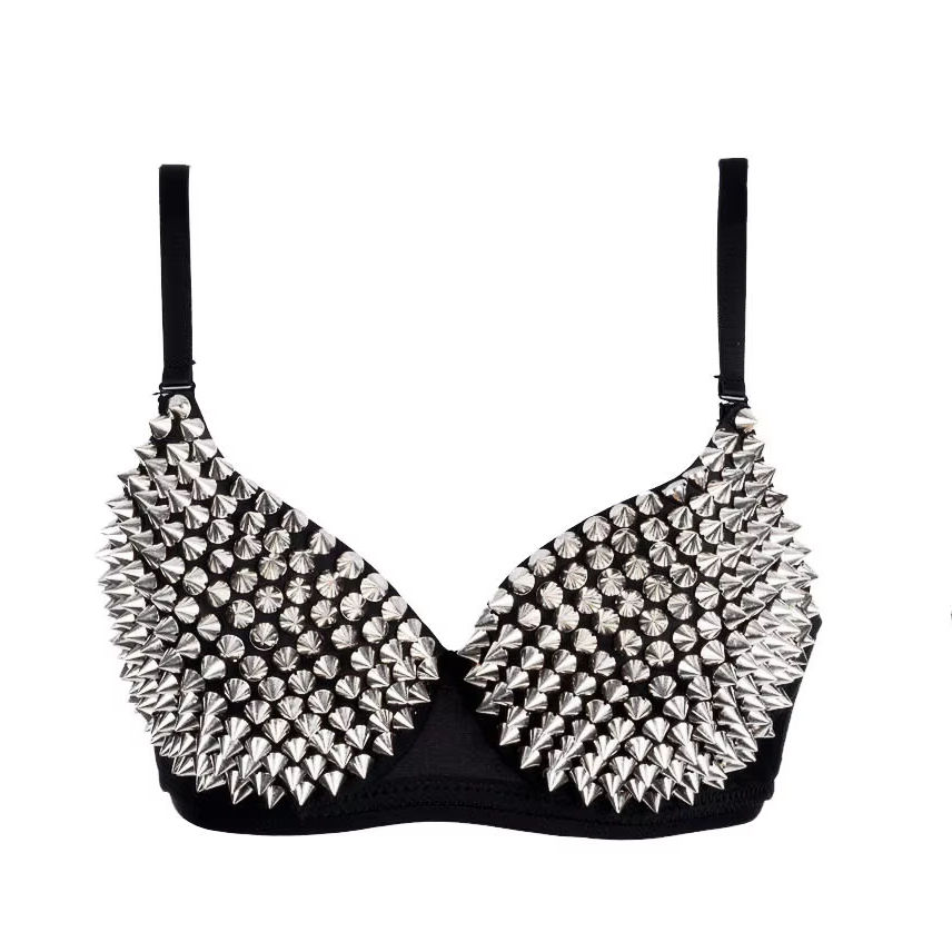 Top de sujetador sexy estilo punk con remaches y soporte de acero, ideal para espectáculos de club y ropa de bailarina para mujer.