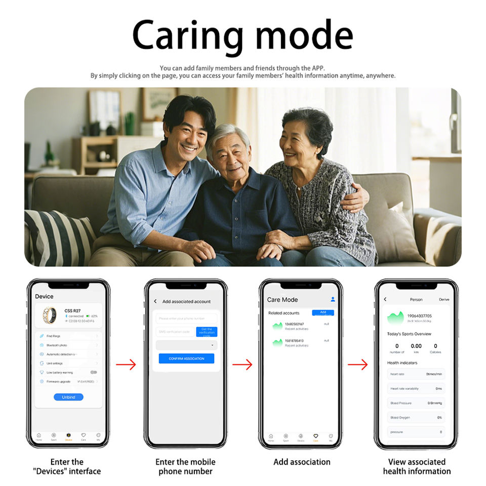 Contador de pasos, Rastreador de calorías, Cuidado familiar, Intercambio de datos
