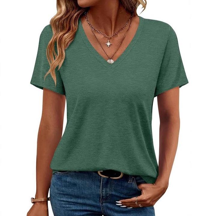 Camiseta de Verano para Mujer, de Color Sólido, Manga Corta, Corte Ajustado, Cuello en V