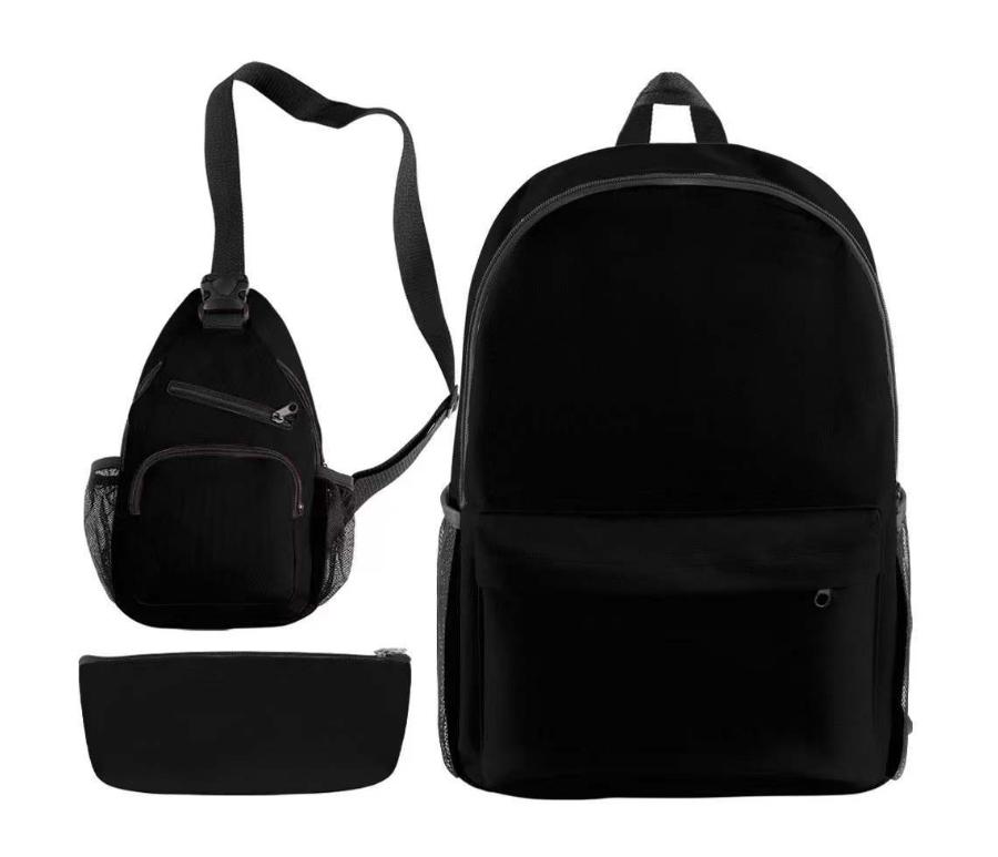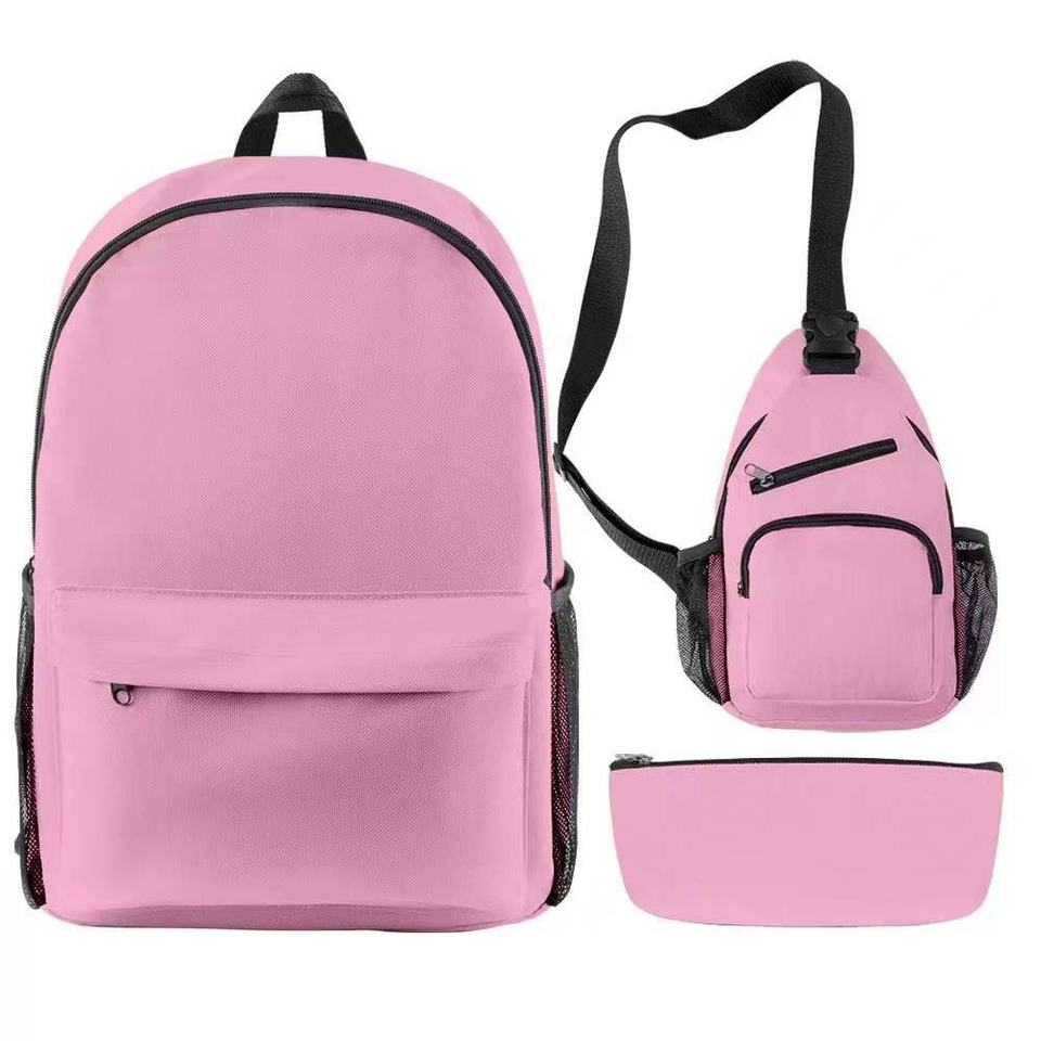 Mochila caliente de tres piezas para estudiantes con forro de nailon, logotipo de impresión opcional multicolor, bolsa de lápiz cruzada, bolsa de viaje de almacenamiento