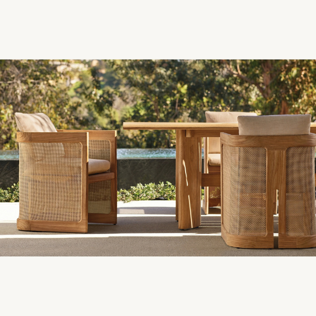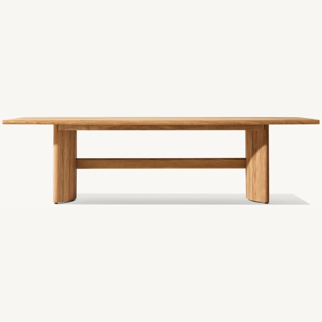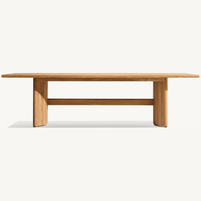 Mesa rectangular en oferta, hecha de madera de teca, adecuada para comedor en exteriores o interiores, estilo minimalista.