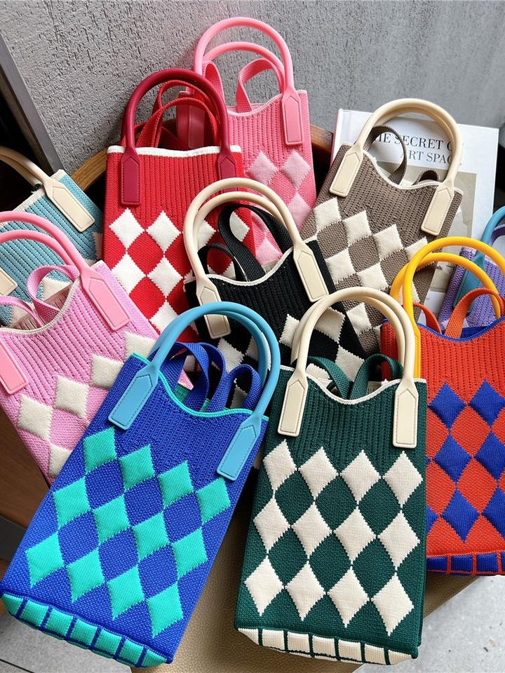 Bolso de Mano de Diseño Rómbico para Teléfono Móvil, Mini, Color Caramelo, con Patrón Geométrico y Cierre Abierto Tejido, de Moda y Gran Venta