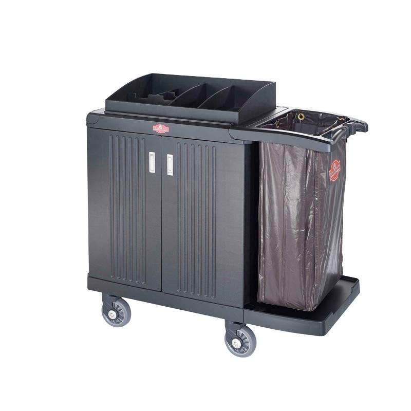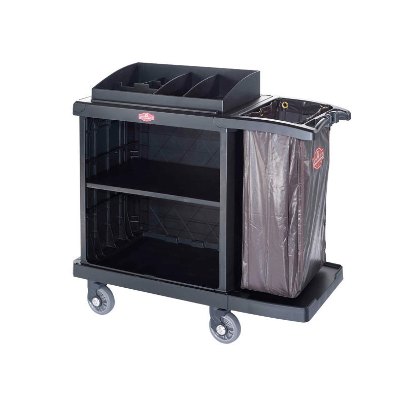 Carros de Limpieza Multifuncionales de Plástico para Habitaciones de Hotel, Carro de Servicio de Limpieza Rubbermaid Negro con Equipo