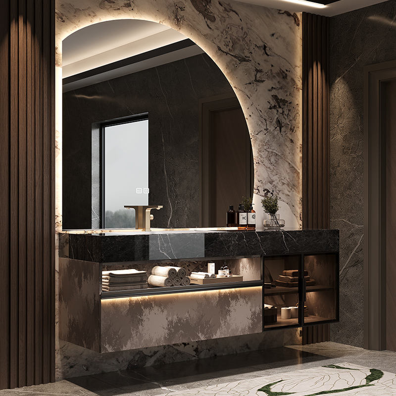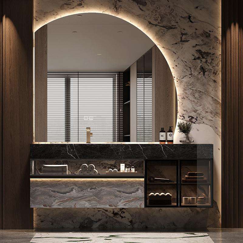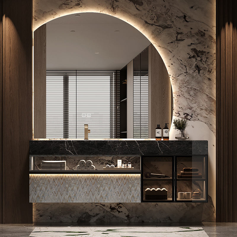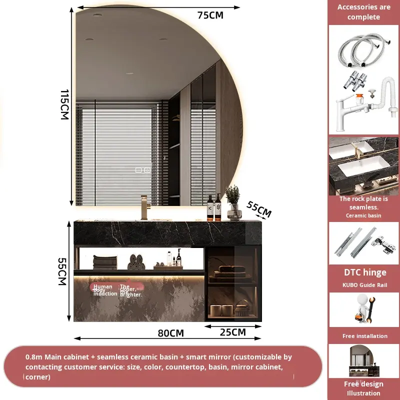 Mueble de Baño con Lavabo Integrado de Cerámica sin Costuras Estilo Hotel con Espejo Plano Inteligente y Funciones Antivaho
