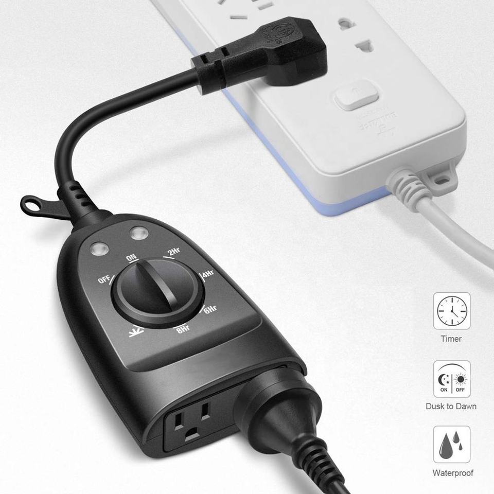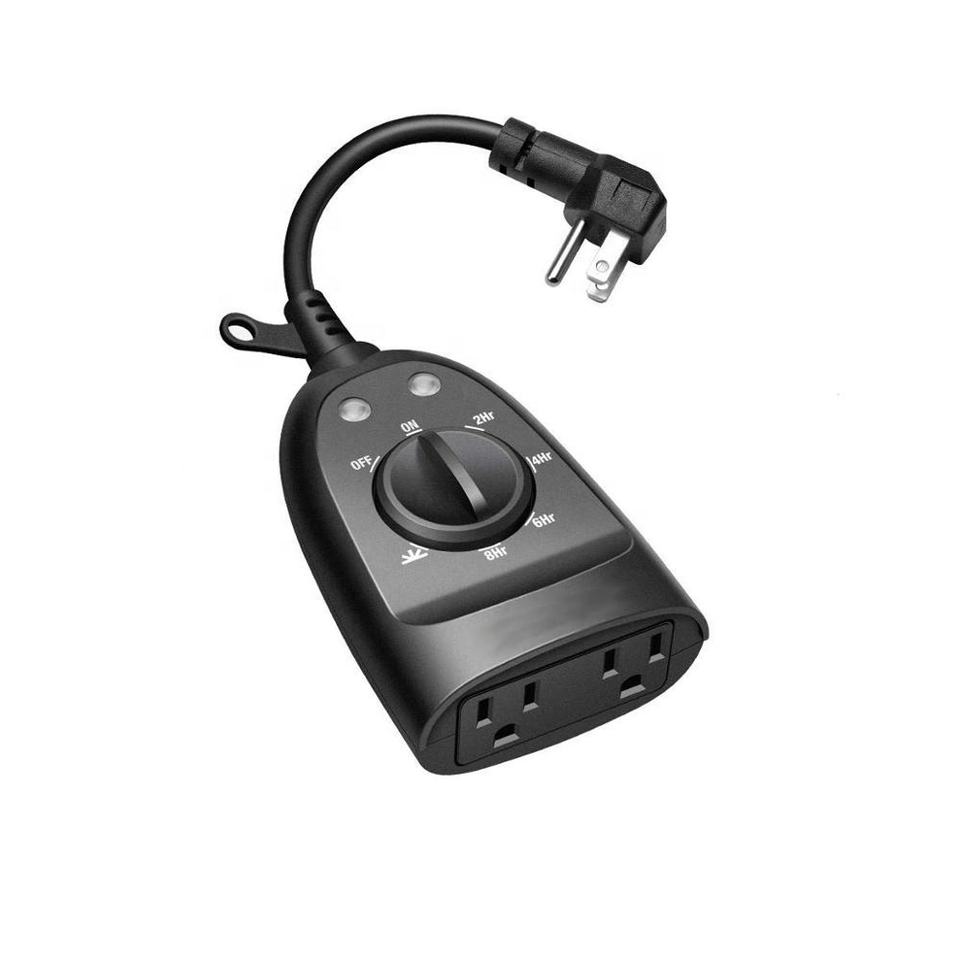Temporizador con Sensor de Luz Fotoeléctrico a Prueba de Agua de PVC de 15A con Función de Cuenta Regresiva para Hogar y Jardín, Opciones de 8 Horas, Enchufe NEMA, 2 Tomas de Corriente