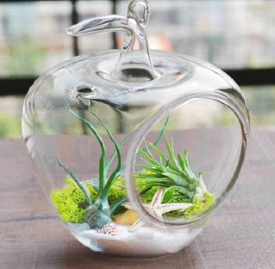Terrario de cristal en forma de casa con marco negro y base de madera, con una orquídea, helechos y planta de lunares rosas al por mayor