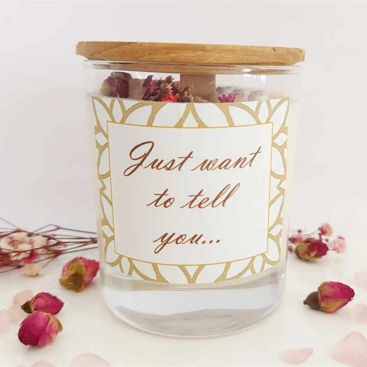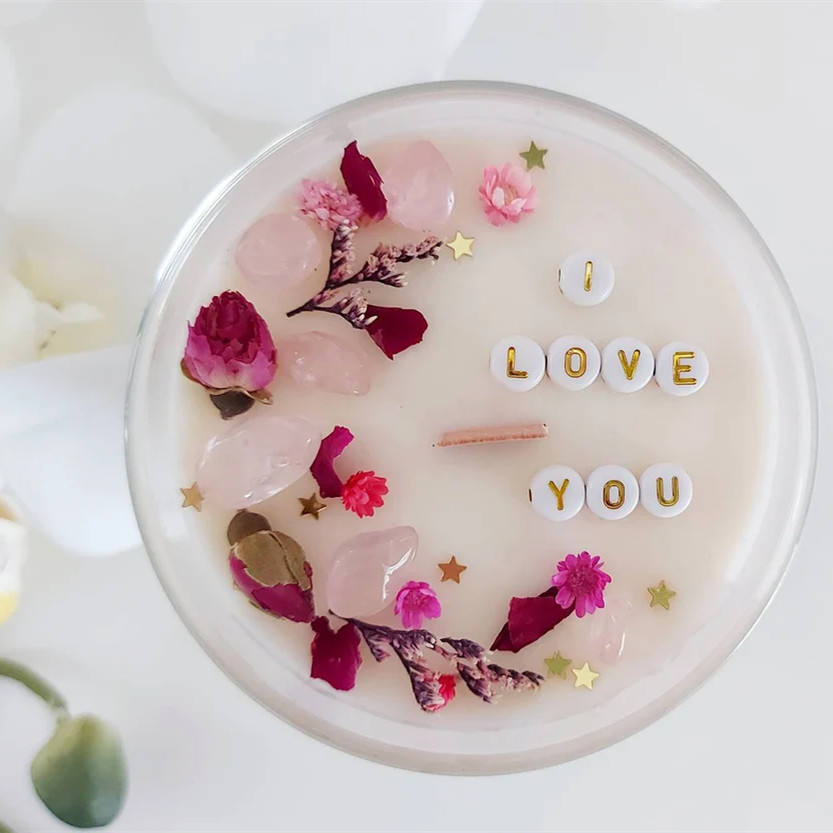 Vela Aromática Personalizada Huaming con Mensaje Secreto en Cristal de Cuarzo Rosa, con Flor Roja y Mensaje Romántico en su Interior