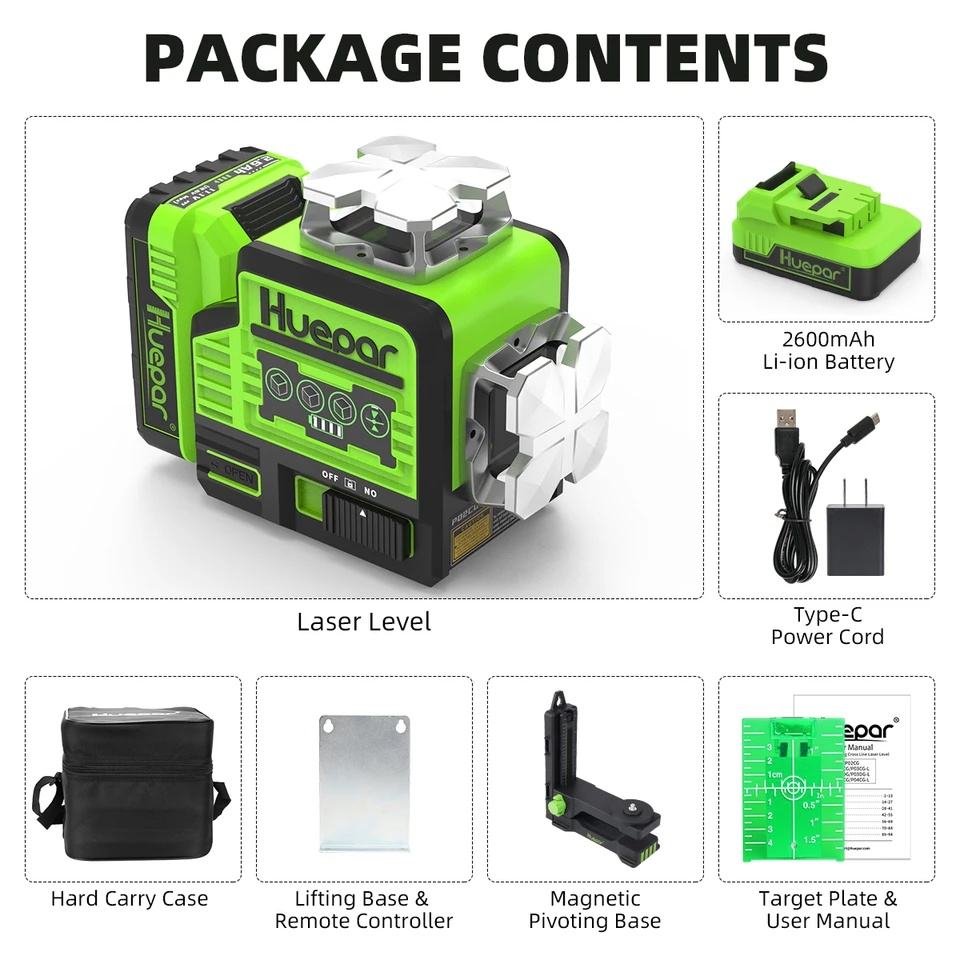 Huepar Industrial, nivelador automático de 360° con control remoto por Bluetooth, línea cruzada de haz verde en 2D con 8 líneas, batería grande de iones de litio de 2.