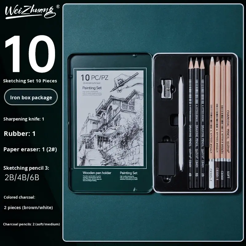 Juego de lápices de dibujo Hui Xiang Bo Da en caja metálica, para estudiantes de arte, lápices de carbón, lápices mate 2B para principiantes