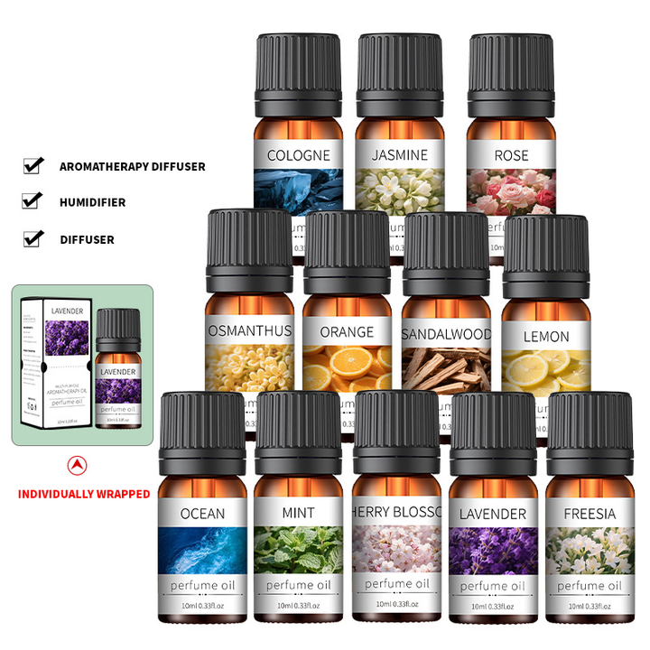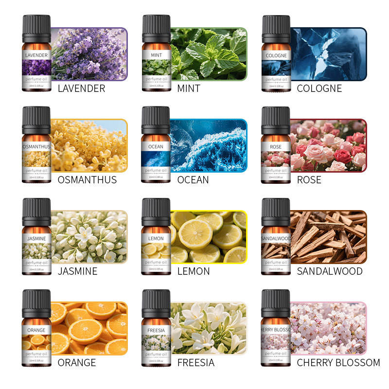 Geranio oloroso, Rosa, Romero, Eucalipto, Lavanda, Limón, Naranja, Jazmín, Mandarina, Manzanilla, Sándalo, Menta, Canela