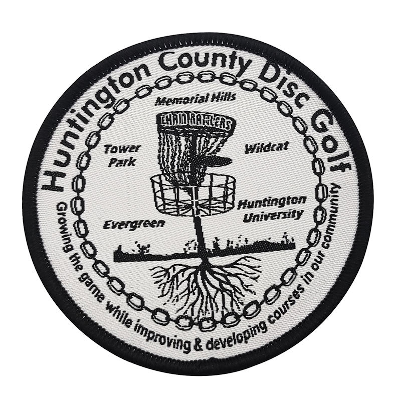 Cesta de disc golf con diseño de árbol de Huntington County en parches tejidos modernos y parche tejido para accesorio de mercancía personalizada
