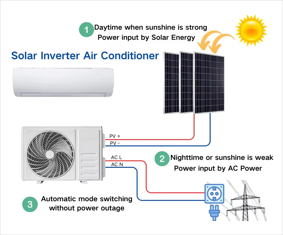 Mini Aire Acondicionado Híbrido Solar DC/AC para Uso en Exteriores, Fácil Instalación, 12000 BTU, 18000 BTU, 24000 BTU, para Hogar