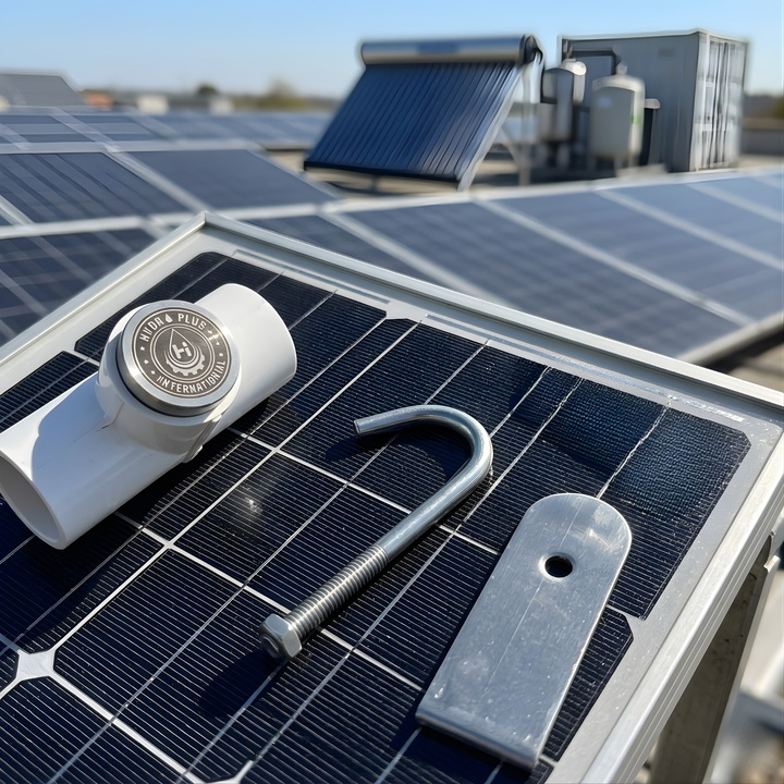 Aspersor de limpieza solar Hydroplus SS304 con soporte en J de acero inoxidable y conector de tubería de PVC para irrigación, refrigeración y lavado.