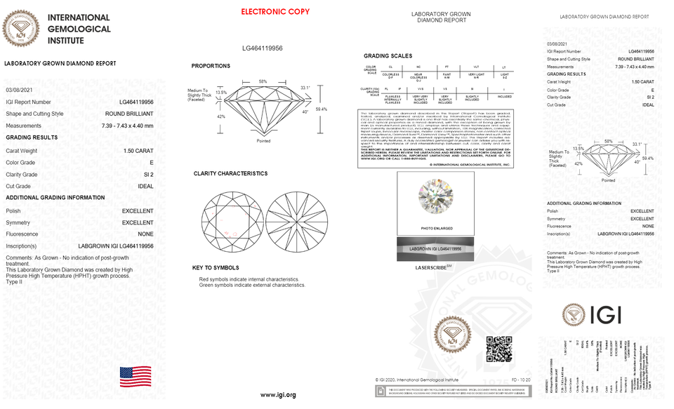 Diamante Sintético (Creado en Laboratorio) con Corte Brillante, Certificado IGI, 1.50 Quilates, Color E, Claridad SI2, Piedra Preciosa Suelta para Joyería