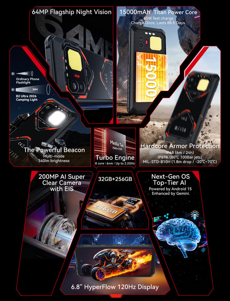 Teléfono Ultra Resistente IIIF150 B2, Pantalla de 6.8 Pulgadas, 120Hz, MTK G100, NFC, 15000 mAh, Cámara de 200MP, IP69K, Android 15, 8+256GB