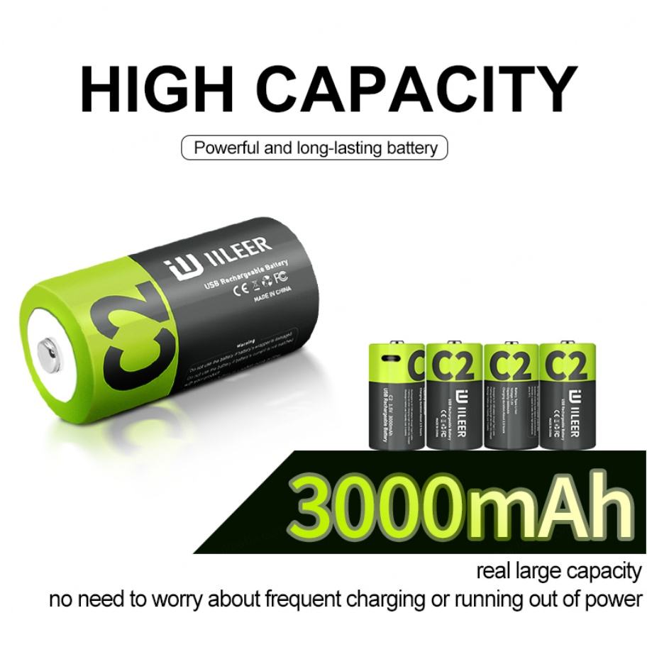Batería de Litio Recargable IILEER C2 de 3000mAh y 1.5V, Carga Rápida y Conveniente para Electrodomésticos