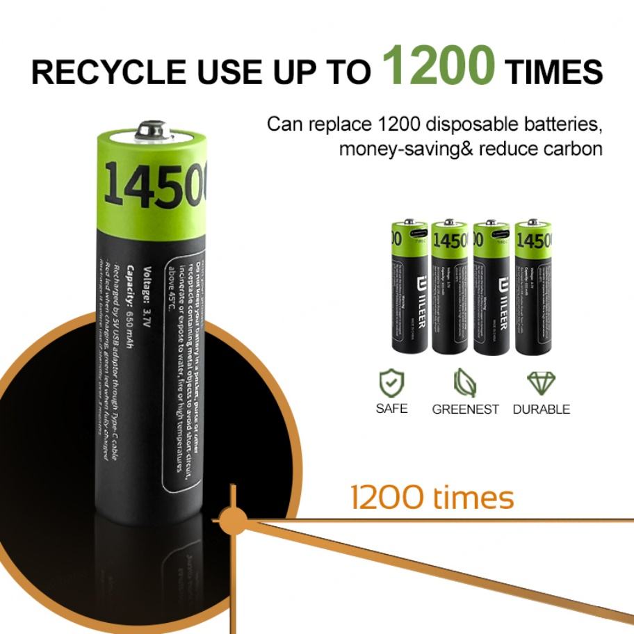 Baterías de Iones de Litio Cilíndricas IILEER, Precio de Fábrica, 14500 mAh, Recargables por USB, 2405 mWh, 3.7V, Alta Tasa de Descarga, Puerto Tipo C