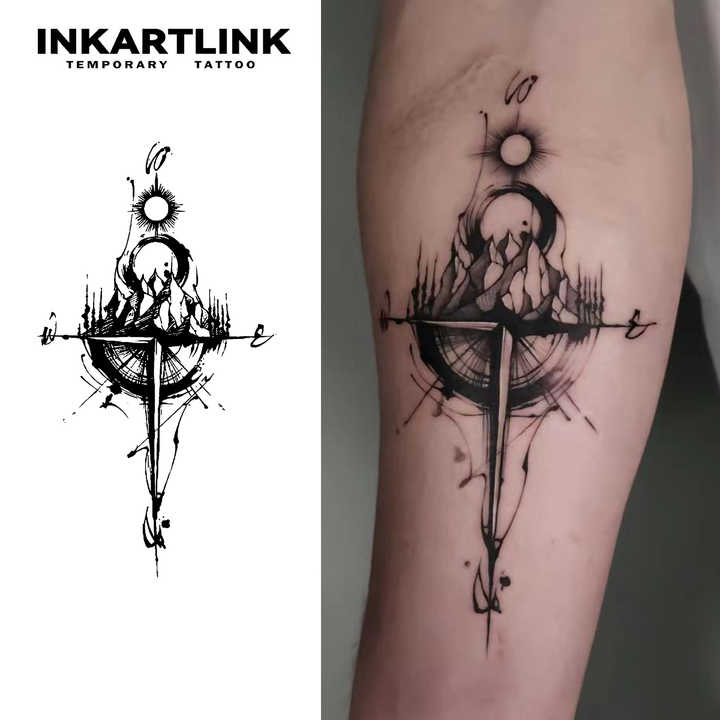INKARTLINK Pegatina de tatuaje de montaña con brújula, mapa de viaje geométrico, sol, luna, bosque, motivos herbales, arte corporal, suministros a granel, 15 días