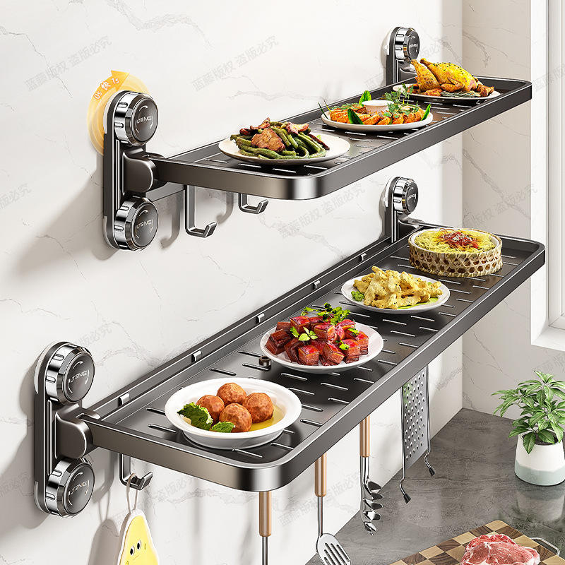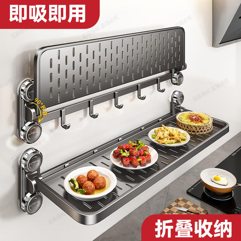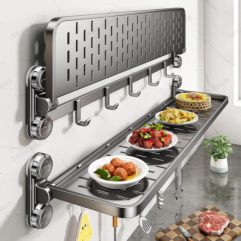 Estante de cocina montado en la pared IOPING, estante de almacenamiento plegable con ganchos para organización de platos de preparación de alimentos, instalación sin perforaciones