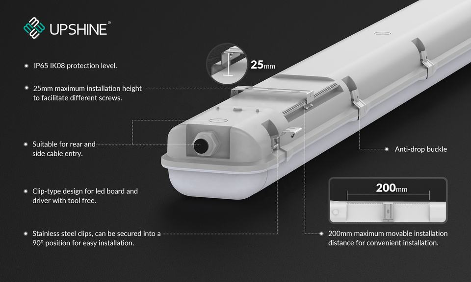 Luz LED Modular Tri-proof IP65 IK08 con Sensor de Microondas Enchufable, Kit de Emergencia, 130lm/W, CCT Seleccionable, Montaje en Superficie/Colgante, CRI 80