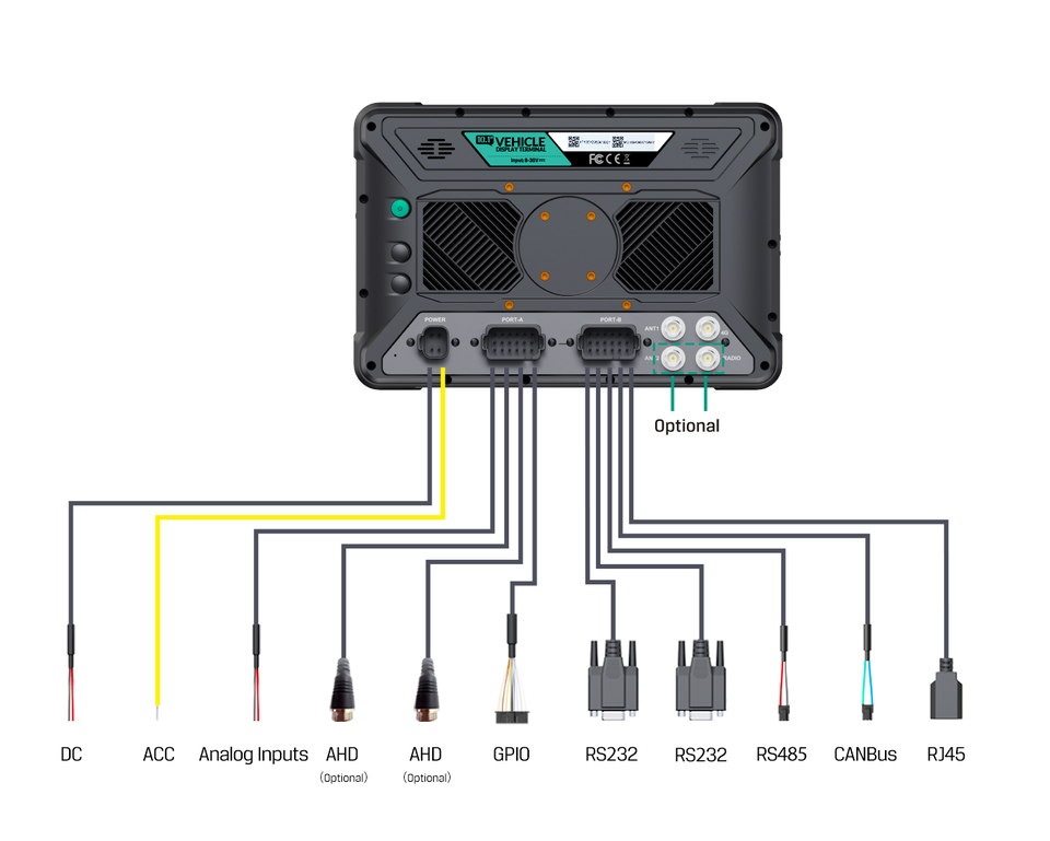 RS232, RS485, CANBUS, RJ45, ACC, DC, GPIO, AHD opcionales