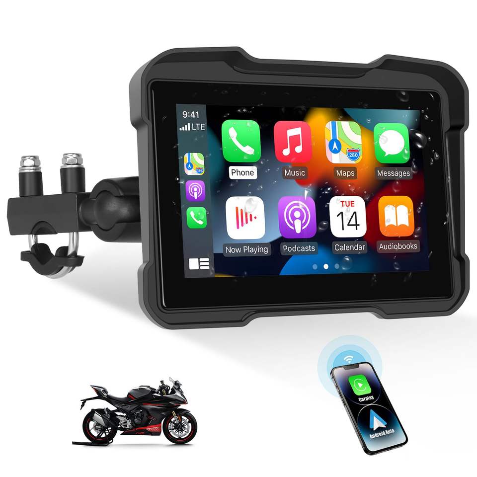 Pantalla de Navegación para Motocicleta Impermeable IP67, Compatible con CarPlay Inalámbrico, BSD, Control Remoto, TPMS y Grabación en Bucle.