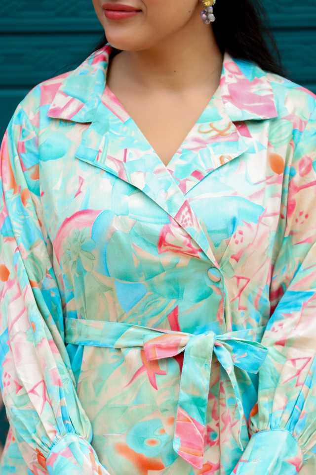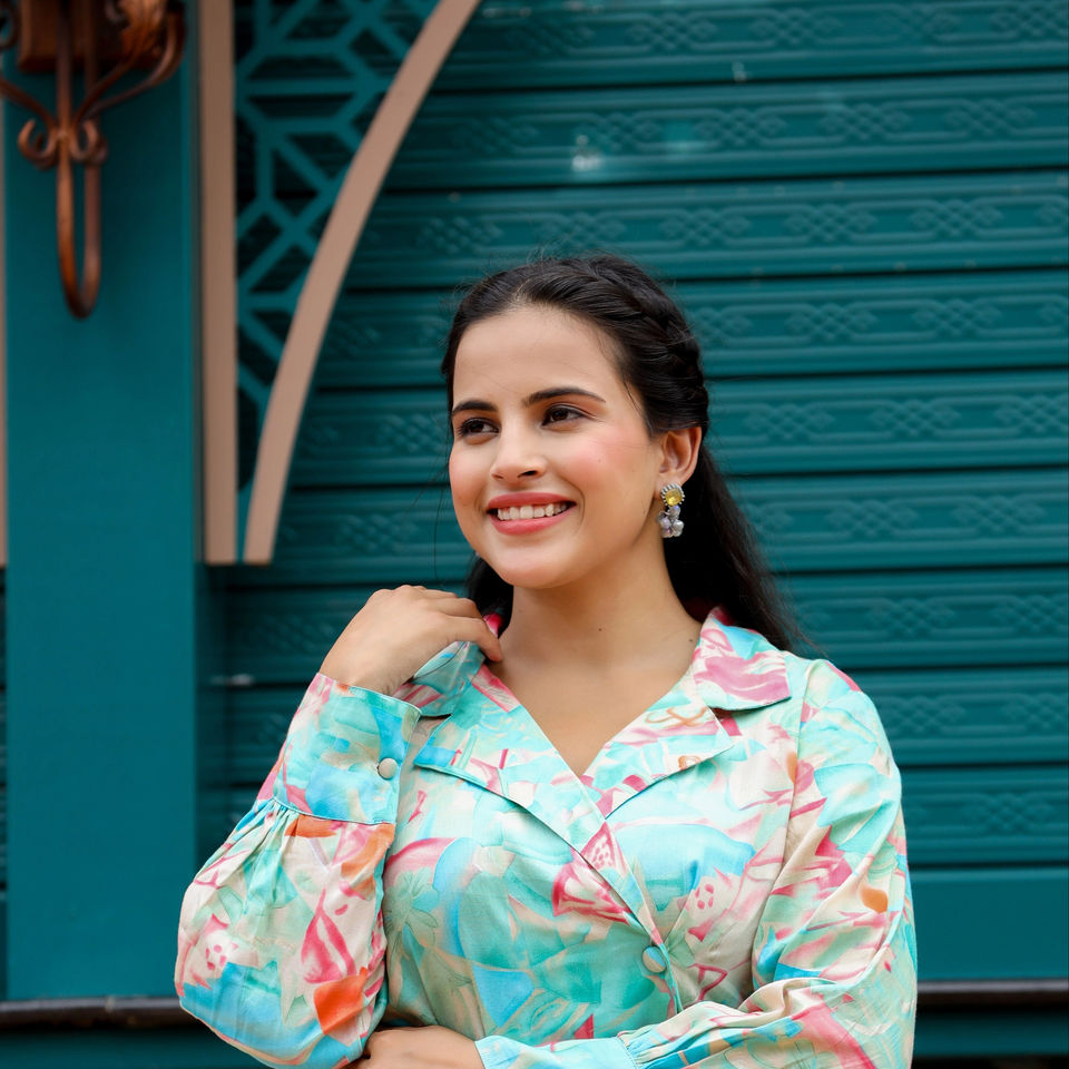 Conjunto coordinado azul hielo - Conjunto de 2 piezas, blazer con cinturón y pantalón, conjunto coordinado de blazer y pantalón de algodón puro con estampado floral.