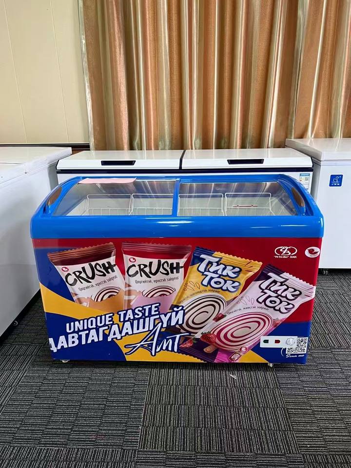 Refrigerador comercial tipo vitrina con tapa abierta para helados, congelador rápido y enfriador instantáneo