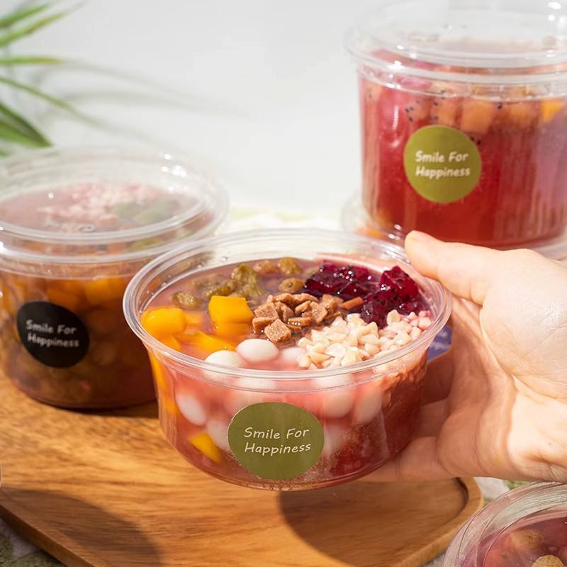 Caja de embalaje para gelatina helada, contenedor desechable redondo para ensalada de frutas con tapa, material PET para almacenamiento de postres fríos