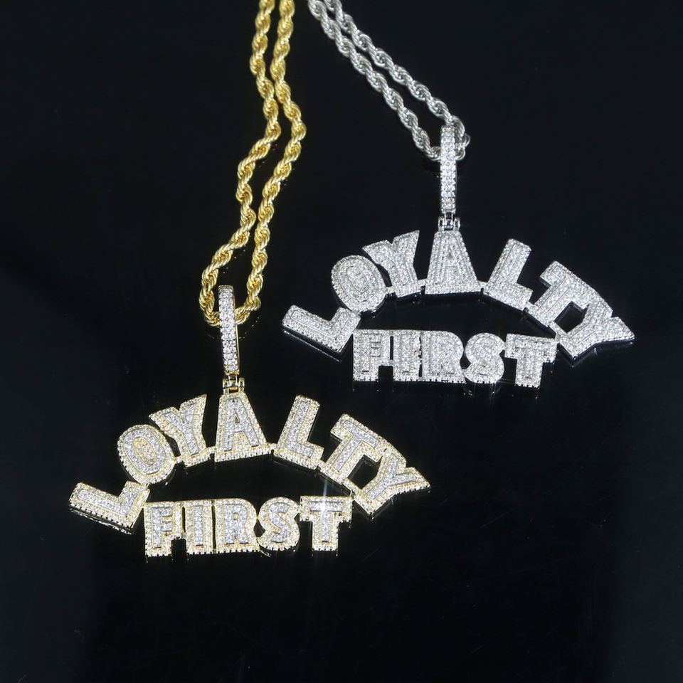 Iced Full 5A CZ pavimentado LEALTAD Primera letra Colgante Cadena de cuerda larga Plateado Hip Hop Estilo Hombres Novio Regalo Latón Zircon