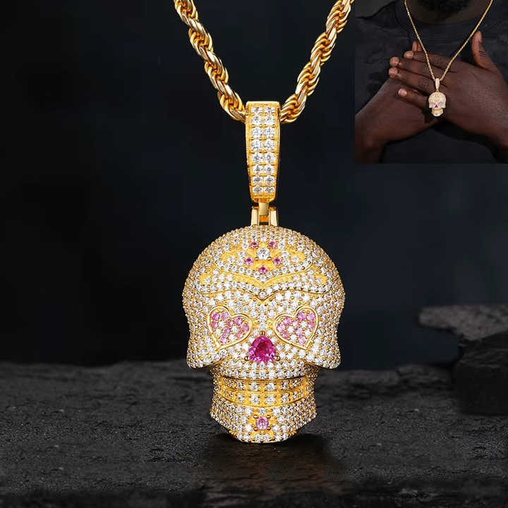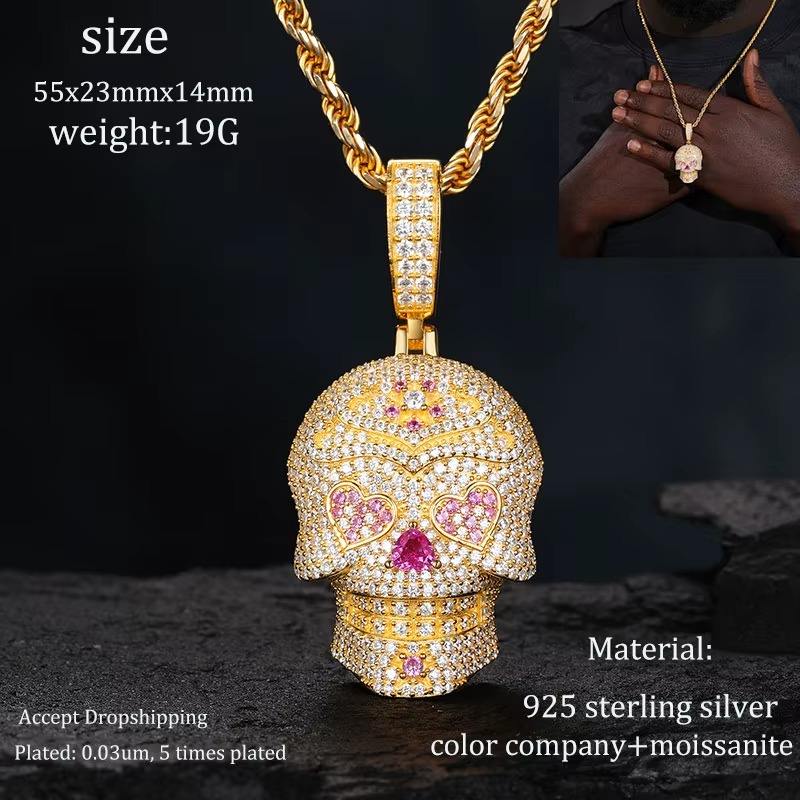 Colgante de calavera de oro helado con ojos de corazón Rosa S925 plata esterlina Hip Hop Moissanite diamante amor collar temático para hombres