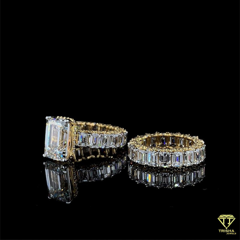 Conjunto de anillo y banda de corte esmeralda helado con diamantes de moissanita brillantes, perfecto para regalo de cumpleaños o aniversario