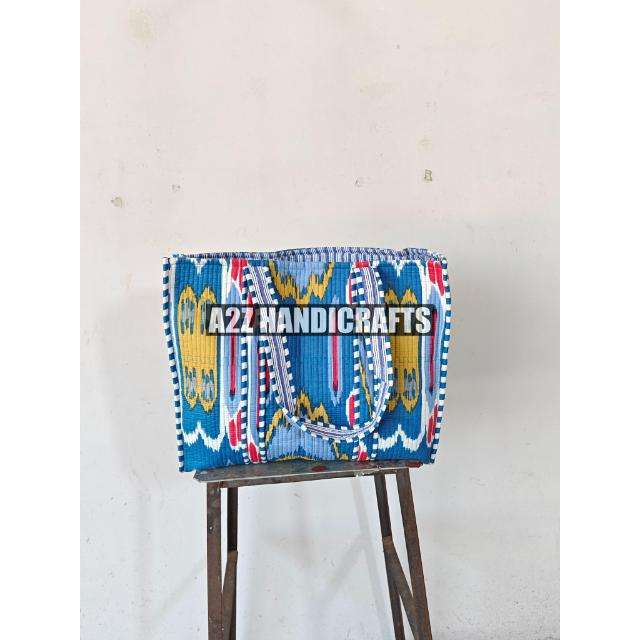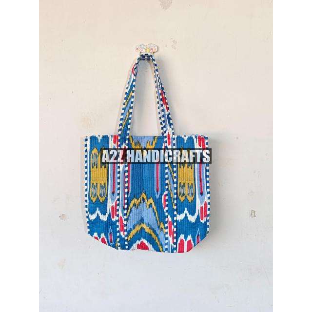 Bolso de mano acolchado grande Reversible de algodón con estampado Ikat, bolso hecho a mano, bolso de artista de comestibles ecológico, dos asas de PC, cierre de sillín